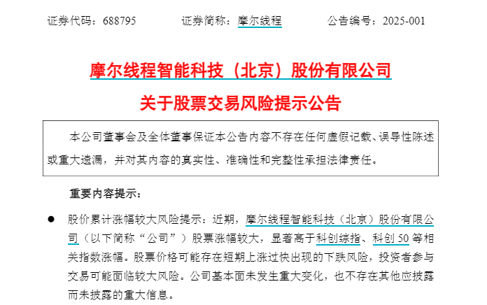 【大河财立方消息】12月11日晚间,摩尔线程发布风险提示公告称,近期公司股票涨幅较大,显著高于科创综指、科创50等相关指数涨幅。股票价格可能存在短期上涨过快出现的下跌风险配资在线炒股,投资者参与交易可能面临较大风险。
